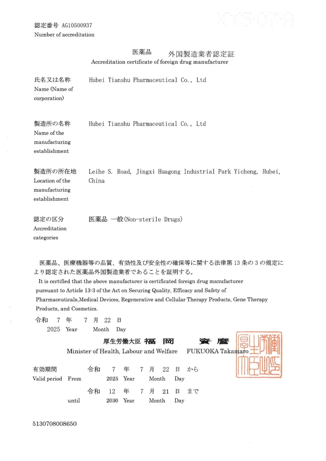 This certification confirms that Tianshu Pharmaceutical's drug manufacturing facilities, equipment, and quality management system fully comply with Japan's Pharmaceutical Affairs Law requirements. The AFM represents: Official recognition by Japan's regulatory authorities (PMDA and MHLW); A strategic milestone for Tianshu Pharmaceutical's expansion into the Japanese pharmaceutical market; Significant advancement in international API registration capabilities.